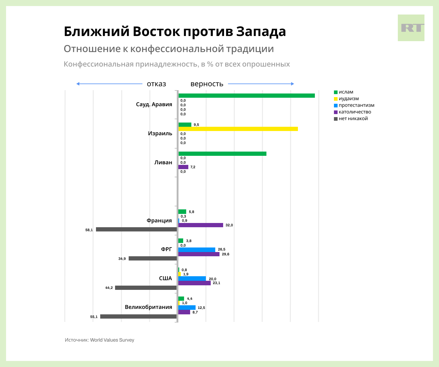 Аравийские теократии и сионистский Израиль схожи друг с другом в таких существенных моментах своего национального бытия-сознания как верность религии предков и крепость семейных устоев. И ровно в этих же моментах ближневосточные лидеры мирового рейтинга ИСБ расходятся с едва ли не большинством современных наций, обнаруживая при этом принципиальное несогласие с насаждаемой Западом моделью «прогресса», которая культивирует абсолютный разрыв с традицией. Проиллюстрируем наш тезис на материале Мирового обзора ценностей.
