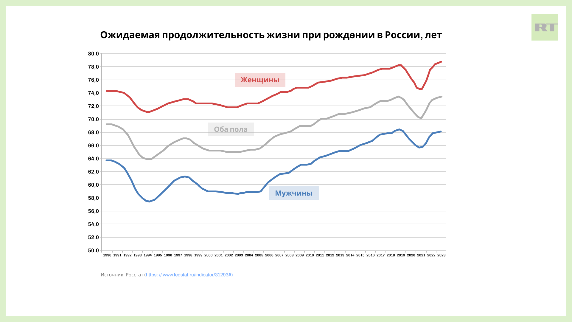 С начала 1990-х годов Россия переживала демографический кризис, и вплоть до 2005 года показатель ОПЖ оставался на уровне 64-65 лет. В 2006 году продолжительность жизни мужчин впервые с 1990-х годов превысила пенсионный возраст, составив 60,4 года. В 2012 году ОПЖ для обоих полов побила рекорд советского времени и составила 70,24 года; по итогам 2015 года впервые был превзойден уровень в 71 год; в 2017 году - 72 года; в 2019 году - 73 года. После ковидного проседания российский показатель ОПЖ вернулся к росту, превзошёл допандемийный уровень и составил 73,4 года. Это лучший показатель ОПЖ в российской истории. Однако в сравнении со многими другими странами Россия по-прежнему проигрывает, поэтому работа по повышению средней продолжительности жизни россиян должна быть системной и поступательной.